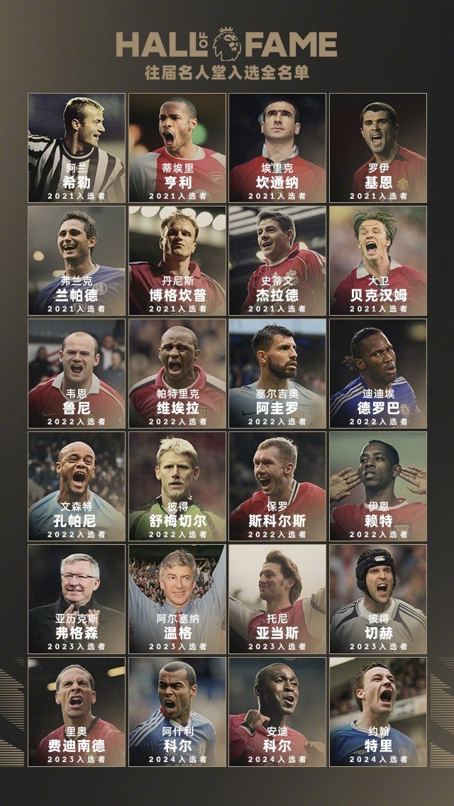 历届英超名人堂回顾:弗格森、温格、亨利、坎通纳等24人在列